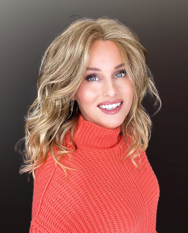 Showgirl by Mane Attraction is flirty and fun! The lace front and lace mono part allows for a natural-looking center part and off-the-face styling. This stylish look features a sleek, long curtain fringe that flows into soft curls throughout.